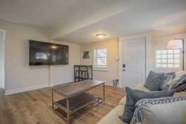The living room features a comfy couch and a huge flat-screen Smart TV. The fully equipped kitchen has stainless steel appliances and soft-close cabinets. The nicely renovated bathroom has a wonderful walk-in shower. The spacious bedroom is filled with tons of natural light and includes a comfortable king-size bed, Smart TV, and dresser. Outside, you can enjoy the twinkling lights hanging over the fire pit.