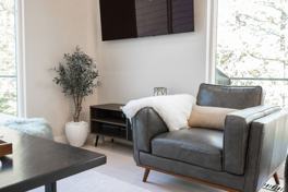 With 6 bedrooms, a bonus office/sleeper room, and 4.5 bathrooms, this place is built for making memories. The main house features a living room with huge floor-to-ceiling windows, cozy seating, and access to the wraparound deck with a fire pit and barbecue. The fully stocked chef’s kitchen has high-end appliances and a big dining space that opens to the deck. The primary suite has a king-size bed and a spa-style en-suite with a soaking tub, walk-in shower, double sinks, and deck access. Bedrooms 2–4 in the basement each have queen beds and share a full bath with a tub/shower. The bonus room on the top floor is set up as an office with a queen sleeper sofa and private ¾ bath. The second living room in the basement is great for movie nights or game time, complete with an electric fireplace, couch, and desk. There is also a laundry room with one of two full washer/dryer sets and a half bath conveniently located off the main living space. The connected apartment has a living room with a comfortable couch, fireplace, and TV, as well as a second fully equipped kitchen and dining area. Bedroom 5 on the top floor has a king-size bed with a walk-in closet and direct access to a full bath. Bedroom 6 in the basement is a spacious room with a queen bed, twin bunk, desk, and lounge area. There is also a second full-size washer/dryer set downstairs.