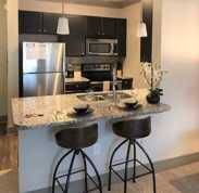 This fully upgraded apartment features stainless appliances, white granite countertops, tile backsplash, and pendant lighting. It is furnished with top-of-the-line appliances and has a large patio with scenic views and a spacious walk-in closet. The master bathroom offers a glass-enclosed shower and tile backsplash.