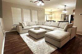Step inside and be greeted by an open floor plan bathed in natural light, effortlessly blending sleek modern design with cozy comfort. Whip up gourmet meals in the fully equipped kitchen, then gather around the spacious dining table. Unwind in one of the two inviting living areas, each boasting a large-screen TV. The spa-like bathrooms feature fluffy towels and essential toiletries, and the master suite pampers you with a luxurious bathtub and shower. Step outside and soak up the Texas sunshine in the private fenced backyard, perfect for barbecues, games, or simply relaxing under the open sky.