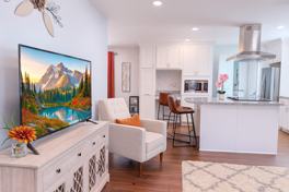 This newly renovated home features high-end finishes, smart TVs, and a gourmet kitchen. The fully equipped kitchen includes full-size appliances, cookware, dishware, utensils, a coffee station with a drip coffee maker, and a tea set. There is comfortable seating in the chic living room and Roku Smart TV where you can log into your own YouTube TV, NFL RedZone, Netflix and HBO. The primary bathroom has a sleek walk-in shower, and the second full bathroom has a soaking tub.