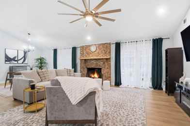 This home perfectly blends comfort, style, and convenience. Relax in the inviting living room with a smart TV and cozy indoor fireplace, or whip up delicious meals in the fully equipped kitchen and convenient kitchenette, designed for effortless cooking and entertaining. Step outside to your private patio and fenced yard, featuring a sitting area and fire pit, the perfect spot to unwind under the stars and enjoy quality time with family.