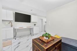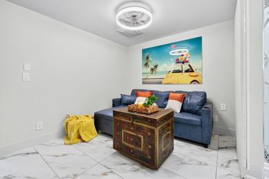 This fresh and modern coastal retreat offers a bright, open layout with stylish decor and marble-look tile flooring. The cozy bedroom features a plush queen bed and hotel-quality linens. The living area includes a comfy sectional with a queen-size pull-out, a large smart TV, and a sleek kitchenette equipped with a full-size fridge, double burner stove with induction cookware, microwave, coffee maker, sink, utensils, dishes/cups, and a dining table. An in-unit washer/dryer combo unit is included for your convenience. The spa-inspired bathroom features an oversized glass-enclosed shower with beautiful tilework and modern fixtures.