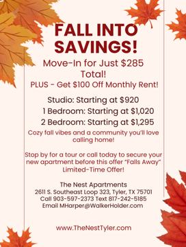 πΏ Welcome to The Nest Apartments β Tylerβs Hidden Gem! Studios, 1 Bedrooms & 2 Bedrooms Available Now Move-In Specials Happening Today! π¨ Looking for a cozy, stylish, budget-friendly place to call home? The Nest has your next vibe. Whether youβre leveling up to your first apartment or downsizing into a peaceful retreat, weβve got a space with your name on it. β¨ Current Specials π₯ Move in for as low as $285 TOTAL π₯ PLUS get $100 off monthly rent (limited time!) Starting Prices: β’ Studio β from $920 β’ 1 Bedroom β from $1,020 β’ 2 Bedroom β from $1,295 πΏ Call For ALL Available Floor Plans The Den β 1x1 β 602 sq. ft. Perfect for cozy living with open-concept dining + unwind space. The Perch β 2x1.5 β 800 sq. ft. Spacious layout with two dreamy bedrooms, extra storage, and a patio. π Community Amenities β’ Sparkling swimming pool β’ On-site laundry facilities β’ Updated kitchens β’ Hardwood-style floors β’ Central air & heat β’ Private patios/balconies (select units) β’ Quiet community with easy access to Loop 323 & local shopping π§ Optional All Bills Paid (Starting @ πΎ Pet Friendly π Location 2611 S. Southeast Loop 323, Tyler, TX 75701 Minutes from dining, shopping, and everything Tyler has to offer. π Ready to Schedule a Tour? Call: 903-597-2373 Text: 817-242-5185 Email: **** Website: www TheNestTyler com