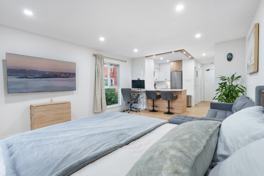 This bright, open-concept studio features a comfortable queen bed, a cozy lounge area with a sofa and smart TV, and a modern full kitchen with stainless steel appliances and all essentials. The updated full bathroom includes a walk-in shower. Ample storage is provided with a large closet and dresser set-up. Enjoy views from the private balcony.