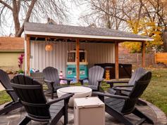 The cozy living room features a large sectional sofa, an electric fireplace, and a smart TV. The game room includes a pool table and bar seating overlooking the wet bar room. The fully renovated kitchen is equipped with modern appliances and all cookware essentials, and there's an elegant dining room with seating for memorable meals. The wet bar room includes a gourmet coffee bar, cocktail-making essentials, a sink, and a wine fridge. Entertainment options include a basement gaming zone with an Xbox Series S, multiple smart TVs throughout the home, family games, and cozy seating areas. Enjoy the deck, a hot tub under the awning, a firepit area with a propane fire feature, a unique retro-style outdoor bar, and an outdoor seating area.