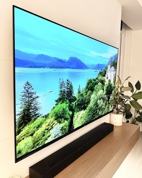 * The living room is designed with a large comfortable Natuzzi Italia sectional, a Sony Bravia 65" 4k smart TV, a Telus cable box, an Apple HomePod, and tastefully chosen accessories and art.