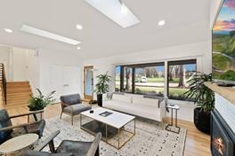 The sunny entertainment room with a bar area overlooks the freshly landscaped backyard featuring a putting green, gas grills, patios, and a hot tub. The main floor also includes an enlarged laundry, a half bath, and a two-car attached garage. Upstairs, there are two additional queen-size bedrooms with a shared full bathroom. The finished garden lower level includes an office/bedroom and a full bathroom.