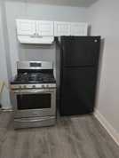 - A well-equipped kitchen featuring a refrigerator and gas stove top