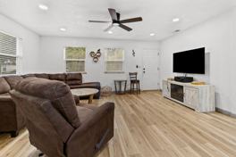 Step inside to a spacious living area filled with natural light, modern furnishings, and wood-style flooring throughout. The open floor plan connects the living room, dining space, and fully equipped kitchen, creating an ideal setting for gathering, dining, or working remotely. The kitchen features stainless steel appliances, a large island with seating for four, and everything you need to prepare meals, including cookware, utensils, and a coffee maker. Additional features include high-speed Wi-Fi, a smart TV with streaming access, and in-home laundry with a full-size washer and dryer. The fenced-in backyard is private and pet-friendly, offering plenty of room for outdoor relaxation.