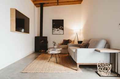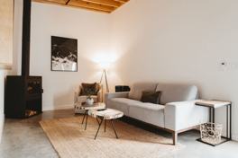 The open living area features a wood-burning fireplace, comfortable seating, and plenty of natural light. The fully equipped kitchen has cooking essentials, and the dining nook offers a cozy space for meals or morning coffee. Both bedrooms feature plush queen beds, soft linens, and simple, serene décor. The clean and modern bathroom is stocked with fresh towels and thoughtful touches.