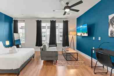The combined living and dining area are furnished with LED lighting and modern furniture. This studio offers a private oasis with plenty of natural light, wooden floors and finishes. The apartment includes a 50" HD smart TV, a kitchen with silverware, in-unit laundry, AC and heating for full temperature control, and hotel caliber pillows.