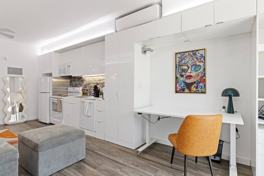 This stylish studio features a modern, convertible layout with a fully equipped kitchen including a coffee maker, kettle, olive oil, salt, pepper, sugar, pots, pans, cutlery, dishes, microwave, toaster, oven, stove, fridge, and dishwasher with detergent. Included essentials are shampoo, conditioner, body wash, towels, linens, a hair dryer, an iron, an ironing board, room-darkening shades, a 50" smart TV, and high-speed Wi-Fi. A washer and dryer with laundry supplies are also included.