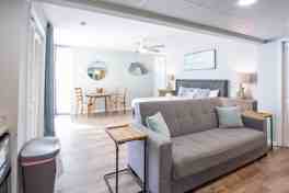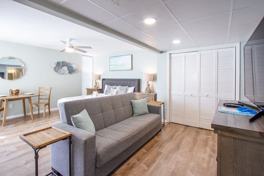 Designed for both comfort and convenience, this studio features a renovated kitchenette with elegant quartz countertops, a sleek undermount sink, soft-close cabinetry, and modern appliances, including a two-burner cooktop, under-counter refrigerator, and portable toaster oven. Everything you need to prepare meals is right at your fingertips. The cozy sitting area seamlessly flows into a stylish bathroom with a modern, standalone shower, quartz vanity, and a bowl sink, creating a spa-like atmosphere for your relaxation.