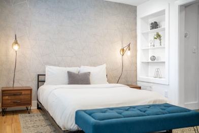 This studio blends modern finishes with everyday practicality, offering more than a typical hotel stay. Inside, you’ll enjoy a queen bed with premium linens, a brand-new stainless steel appliances, quartz countertops, tile backsplash, cookware, and utensils. The in-unit washer and dryer add convenience. The Nest thermostat allows for personalized climate control. The bathroom is stocked with bath essentials and high-quality soaps, with new tile flooring. The living area features a 55" Smart TV, free high-speed Wi-Fi, and a large couch that can sleep one additional guest. Refinished hardwood floors are featured throughout, with new tile in the kitchen and bathroom. Keypad entry is available via Lynx smart software system. Multiple seating options are available for work and dining, including tables and bar-height surfaces.