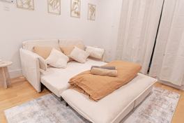 Enjoy a bright, open layout with a private balcony, modern kitchen, in-unit washer, and chic decor. The bedroom features cozy linens and generous storage. With high-speed Wi-Fi, a smart TV, and split AC, this home offers style, comfort, and convenience.
