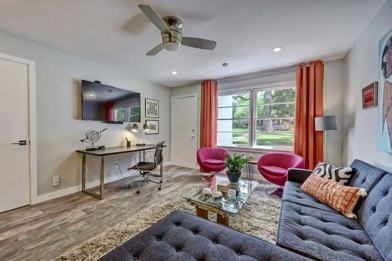 Enjoy ultra-fast Wi-Fi, Hulu + Live TV, a shared patio with a grill and outdoor seating, and a reserved parking spot steps from your door. A workstation with a monitor, keyboard, and mouse is available for $10 per day. A pack ’n Play or highchair is available with 24-hour notice. Dogs are welcome with a fee of $59 per dog, or $120 unregistered.