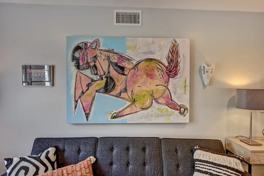 This stylish condo captures the timeless beauty of mid-century design while offering modern amenities. It features designer furnishings, luxe linens, a full kitchen equipped for home cooking, a bathroom with heated marble floors, an in-unit washer and dryer, a streaming-ready smart TV, and original work by Charlotte artist Nico Amortegui. The full kitchen includes a gourmet gas range, convection oven, full-size refrigerator, dishwasher, and all cookware essentials. The open-concept dining area has seating for four.