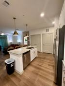 This apartment features a spacious layout with wood flooring, modern lighting, a cozy living area, a smart TV, and a private balcony. The kitchen includes stainless appliances, quartz counters, and an island. The bedrooms offer king-size beds and ample closets.