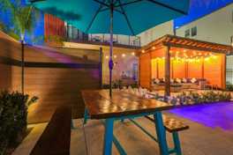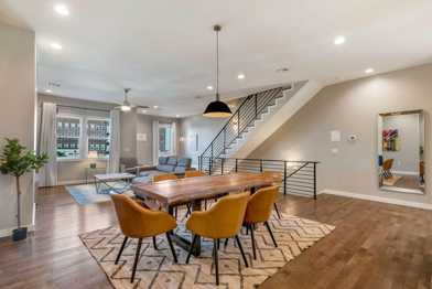 This modern townhouse features high ceilings with light-filled windows and hardwood floors, a modern full kitchen with stainless steel appliances, plenty of closet space, and 3 TVs. Enjoy the fresh air on two balconies with outdoor seating.