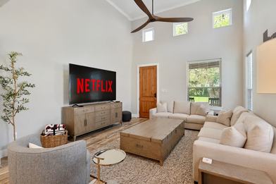 This home is entertainment ready with an open concept living, dining, and kitchen area featuring an 86” TV. The oversized island and fully stocked kitchen make it perfect for group gatherings. Enjoy the backyard with games and seating, and a porch TV for game day. A large grill is available for cookouts.
