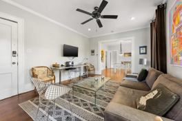 This residence features a king-size bed, ultra-fast Wi-Fi, Hulu + Live TV, and a covered porch. The kitchen is fully equipped with stainless appliances and cookware. The bathroom features modern tile, Nest bath products, and plush towels. An in-unit washer and dryer are also available.