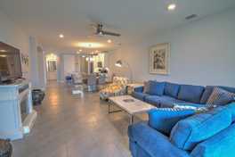 The villa features a kitchen, dining area, and family room. The main bedroom suite includes a 4-poster king-size bed and an en suite bathroom with granite counters, dual sinks, and a glass-enclosed shower. The second bedroom is set-up with 2 twin beds. The second full-sized bathroom has granite counters and a tub and shower combo. The spacious laundry room has a newer washer and dryer. Guests can use the electric grill located in the garage. The screened and covered lanai, accessed from the family room, features an outdoor loveseat, 2 outdoor armchairs and footrests, and an outdoor table.