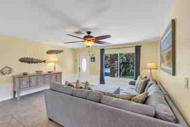 Feel at home in this vacation rental located in the heart of Bonita Springs on a quiet dead-end street with scenic canal homes. This home features a spacious layout with a kitchen in the center, a sprawling family room and living room, a large main bedroom with an attached en suite bathroom, and two additional bedrooms and two additional bathrooms.