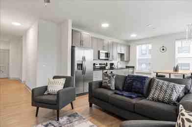 The apartment features a fully equipped kitchen, a smart TV, high-speed Wi-Fi, central heat and air, and a stackable washer/dryer in unit. For entry, there is a lockbox and a Ring doorbell on the outside of the door.
