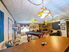 This inviting home offers a fully equipped kitchen with all the essentials for cooking, a large dining table, a cozy den featuring a pool table, bar, and TV. After a day of fun, unwind in the jacuzzi tub or curl up in the oversized lounge chair in front of the fireplace. A private pool (not heated) with patio seating and a BBQ grill is available for your enjoyment.