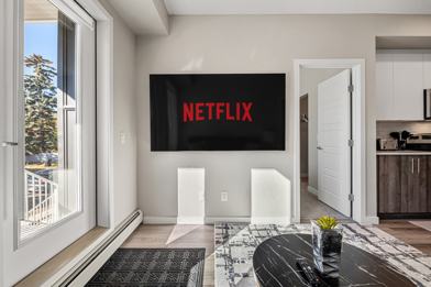 This apartment features fast Wi-Fi (500 Mbps), a 65” smart TV with Netflix, and an in-suite washer and dryer. The fully equipped kitchen includes stainless steel appliances, a 4-burner stove, oven, microwave, refrigerator, freezer, dishwasher with pods, Keurig coffee maker, toaster, blender, and other essentials. Complimentary tea, coffee, Brita, and paper towels are provided.