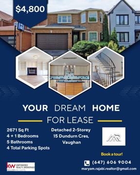 Beautifully Renovated And Spacious 4+1 Beds, 5-Baths Family Home Backing Onto A Park In Uplands. Bright Open-Concept Layout With A Designer Kitchen Overlooking The Family Room, Planked Flooring, Wrought Iron Railings, And Upgraded Finishes Throughout. Features Spa-Inspired Renovated Bathrooms, Pot Lights, Smooth Ceilings, And Elegant High Baseboards And Mouldings. Combined Living And Dining Area Ideal For Entertaining, Plus A Finished Basement With Nanny's Room For Added Versatility. Convenient Walk-In Access From The Garage. Located In A Sought After Family Friendly Neighbourhood Close To Top-Rated Schools, The Promenade Mall, Parks, And With Easy Access To Highway 407. #maryamhomes #2-storeydetachedhome #houseforleasevaughan #5-bedroomforlease