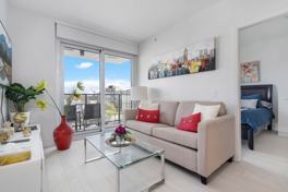 Step into a bright and open living area featuring floor-to-ceiling windows that bathe the space in natural light. The sleek, fully equipped kitchen boasts premium appliances, ample storage, and a stylish layout ideal for home cooking or entertaining. Adjacent to the living area, a private balcony provides a serene spot to enjoy morning coffee or evening views. The bedroom is thoughtfully furnished for restful nights, complemented by a spa-inspired bathroom with high-end finishes. A cozy den provides the perfect set-up for remote work or study. Additional conveniences include in-suite laundry and plenty of storage space.