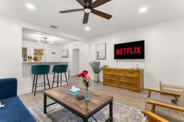 Inside, this home offers a bright, open layout, comfortable bedrooms, and all the modern amenities you need for a relaxing stay. The chef’s kitchen is fully stocked with high-end stainless appliances, a large refrigerator, and a drip coffee maker. The living room features a smart TV and plush seating. Enjoy the private backyard oasis with a private pool, outdoor patio/dining area, BBQ grill, mini golf, giant Connect 4, and poolside loungers. Includes a washer and dryer.