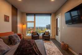 Feel right at home in this cozy, modern apartment filled with warm colors and natural light. Large windows offer beautiful views of the city and mountains, creating the perfect spot to relax with a cup of coffee or unwind after a long day.
