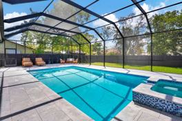 Enjoy the south-facing heated pool and spa, enclosed within a spacious pool screen. The expansive pool deck offers plenty of space for sunbathing, while the spa provides the ultimate relaxation spot. An outdoor kitchen with a grill, 2-burner cooktop, and wine fridge is nestled beneath a charming accent stone wall, inviting al fresco dining. Additionally, there are 4 chaise lounges, a small high-top dining set, and a cozy seating area for kids on the pool deck. The generous backyard space behind the pool is surrounded by a 6' fence.