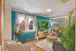 This unique, jungle-themed apartment is thoughtfully stocked with items and amenities to cater to business travelers, couples, and families. The stylish living room is equipped with a 65-inch Smart TV, board games, a comfortable couch and a spacious egg chair. The fully stocked kitchen has all the necessary cookware and spices, plus a dedicated dining area for 6. Notable amenities include in-building laundry and a fully stocked bathroom.