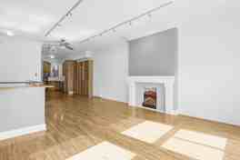 ๐ Open-Concept Living & Dining: Exposed brick accent wall + ornamental fireplace
