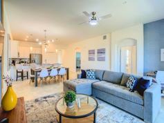 Experience the excitement of the new Epic Universe park this May 22nd by booking your stay in this fantastic vacation condo at Champions Gate. This spacious condo, inspired by the sun of Florida and the magic of Walt Disney World, offers a premium location and elegant style for an unforgettable family vacation. The property features a master bedroom with a king-size bed and a flat-screen smart TV, a second bedroom with a bunk bed and a full-size bed, and a living room with a sofa bed and digital smart TV.