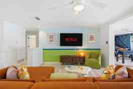 This home is jam-packed with amenities and has everything you need for an amazing vacation. It features a fully stocked kitchen with high-end stainless appliances, a large refrigerator, ample cabinetry and cooking space, and a coffee maker with Keurig, French press, and drip options. The living room has a 65” smart TV and a large plush sofa. The game room includes a foosball table, pool table, arcade games, and pop-a-shot. Enjoy the spectacular backyard and outdoor amenities, including a private pool, basketball court, fire pit, hot tub, putt-putt, corn hole, giant connect 4, outdoor patio, poolside basketball, beach essentials, and poolside loungers with umbrella.