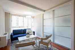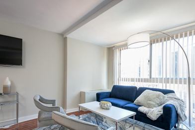 Feel at home in this Foggy Bottom 1-bedroom, 1-bathroom condo located on the 5th floor of a 9-story building with an elevator. The apartment features large windows, hardwood floors, and all brand-new furniture and fixtures. The custom kitchen is equipped with new appliances, including a granite countertop, new oven, induction electric cooktop, and dishwasher. The open dining and living room area includes a new couch, a 42” HDTV, a new queen-size bed, and central air. The bathroom is newly renovated with new tiles, shower, toilet, and vanity, and there is a large closet for ample storage.