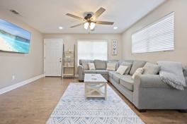 This modern bungalow offers a peaceful retreat in Rockledge, perfect for families, sports enthusiasts, or groups. The open floor plan connects the kitchen, dining, and living areas, creating a welcoming atmosphere for all to enjoy. The outdoor space is a highlight, featuring a fire pit and an outdoor TV, making it ideal for evenings under the stars. The living area is designed for relaxation, with plenty of comfortable seating, a large flat-screen TV, and easy access to the outdoor entertainment space. Whether you’re lounging inside or enjoying the fresh air outside, this home has everything to ensure a memorable stay. The bungalow features four bedrooms, all thoughtfully decorated and equipped with plush beds to ensure a restful night's sleep. Each room has ample closet space, and the master bedroom comes with an en-suite bathroom. Both bathrooms are fully updated with modern fixtures and spacious showers. Enjoy Florida’s beautiful weather in the expansive outdoor area. Sit by the fire pit, catch the game on the outdoor TV, or simply relax with friends and family in the serene setting. The space is perfect for unwinding after a day of exploring. The kitchen is fully stocked with everything you need to prepare meals during your stay, including modern appliances, cookware, and dishware. There's also plenty of counter space and a dining area for enjoying meals together. This spacious home is the perfect retreat for families or groups, offering a mix of modern convenience and outdoor fun. Whether you're in town for a sporting event or just looking to relax, this bungalow has you covered.