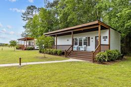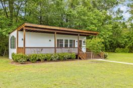 This cabin features a king-size bedroom, a fully equipped kitchen ready for all your cooking needs, and a large, inviting front porch perfect for relaxing and enjoying the outdoors. The property also includes grills, picnic areas, and sitting benches, providing plenty of space for outdoor activities and gatherings.