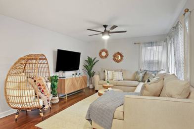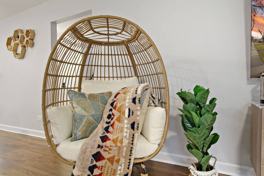 Designed to serve a large family or a business trip with co-workers, the house is fully stocked for your comfort and enjoyment. It features a stylish living room with a 65-inch smart TV, a large comfy sectional and egg chair to seat 10+, board games, and a dedicated dining area. The fully stocked kitchen has stainless steel appliances, cooking supplies, and spices to enjoy a homecooked meal. Other notable amenities include in-unit laundry and a smart home set-up.