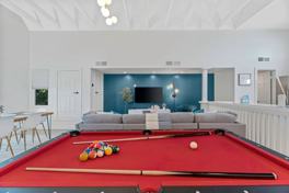 Enjoy the spacious, vibrant living area with a pool table, high vaulted ceilings, Smart TV, and board games for entertainment. The fully equipped kitchen includes a Keurig coffee maker, spices, pots, and pans to enjoy a delicious, home-cooked meal with a dedicated 6-person dining area. There is an in-unit washer and dryer with detergent and softener provided, as well as 1.5 bathrooms with towels, linens, toiletries, and hair dryers.