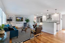 Beautifully renovated, this mid-century modern ranch house in the heart of desirable University Hills boasts high-end finishes. Featuring a recently remodeled kitchen with granite counters, stainless steel appliances, and a geometric tiled backsplash, this home combines style with functionality. Original preserved hardwood floors extend throughout the property, complemented by tile floors in the kitchen, laundry, and bathrooms.