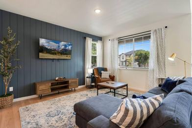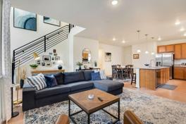 The living space on the main level is designed for comfort and includes a half bathroom, a smart TV, a desk, and a dining area that accommodates up to 6 people. Upstairs, the primary bedroom offers a queen-size bed, a walk-in closet, and a private bathroom with a glass shower. Two additional bedrooms provide a queen-size bed and two twin beds, sharing a Jack and Jill bathroom. A large laundry room on the upper floor adds to the convenience.