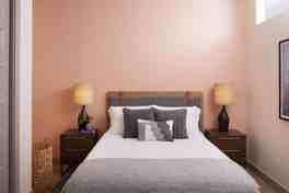 Thoughtfully designed with floor-to-ceiling windows, a chef-style kitchen with stainless steel Samsung appliances, quartz countertops, luxury vinyl plank wood flooring, and nine-foot ceilings, this studio offers modern luxury. The queen bed, solar window shades in living areas, full-size washer and dryer, modular closets for maximum storage and organization, and USB outlets in the kitchen enhance your living experience.