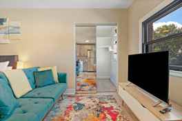 The apartment features a fully stocked kitchen with stainless steel appliances, dishes, silverware, and a chic dining table for two. For your comfort and convenience, a comfortable queen bed, a large walk-in closet, and a bathroom with towels, linens, toiletries, a hair dryer, and an iron are provided. Enjoy the cozy couch, smart TV, high-speed Wi-Fi, and board games for your enjoyment and relaxation. A washer and dryer are available in the building.