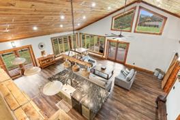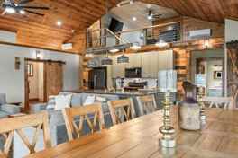 Swasa Farm features an open-concept layout that blends rustic farmhouse charm with modern comfort. The main living area includes a beautifully updated kitchen with ample counter space and a seamless flow into a large dining area, where guests can enjoy meals with serene views of the surrounding hills. Rustic farm-style sliding doors add warmth and character throughout the home, leading to cozy and thoughtfully designed spaces. Upstairs, an inviting entertainment room creates the perfect setting for movie nights and games. Outdoors, the property offers a large, well-kept stable and an expansive riding arena. With a hillside jacuzzi overlooking the rolling hills and breathtaking sunset views, the space provides a truly unforgettable Ellijay retreat.